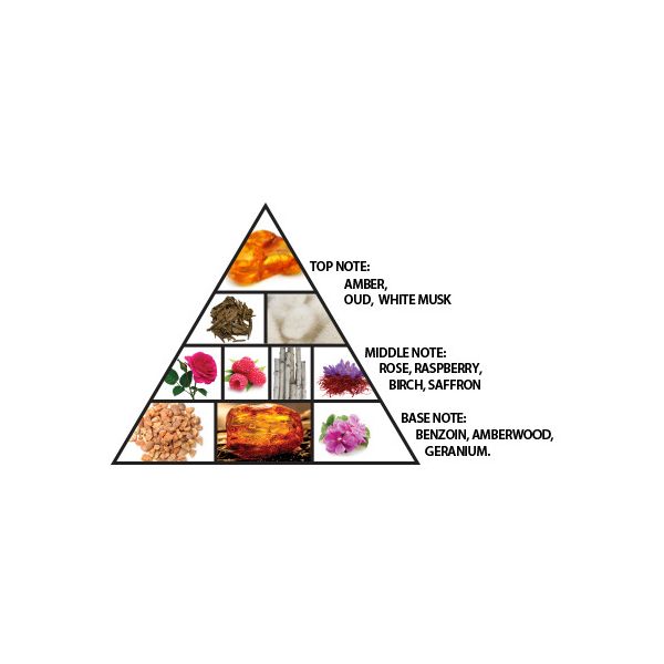 Top Notes:Amber ,Oud & White Musk Heart Notes:Rose, Raspberry ,Birch & Saffron Base Notes:Benzoin, Amberwood & Geranium